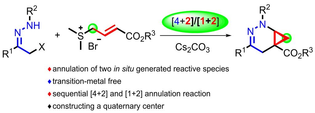 哒嗪衍生物广泛地存在于多种具有显著生物活性的天然产物、药物和农药分子之中,这类杂环的优化合成一直以来都是化工医药行业的热门研究领域。本文作者采用了巴豆酸酯衍生的锍盐作为烯丙基硫叶立德前体,实现了硫叶立德与原位生成的氮杂二烯的[4 + 2]和[2 + 1]串联环化反应,高效合成了具有潜在生物活性的双环[4.1.0]四氢哒嗪衍生物。该合成反应条件温和,操作简便,收率高,可实现克级规模的制备。