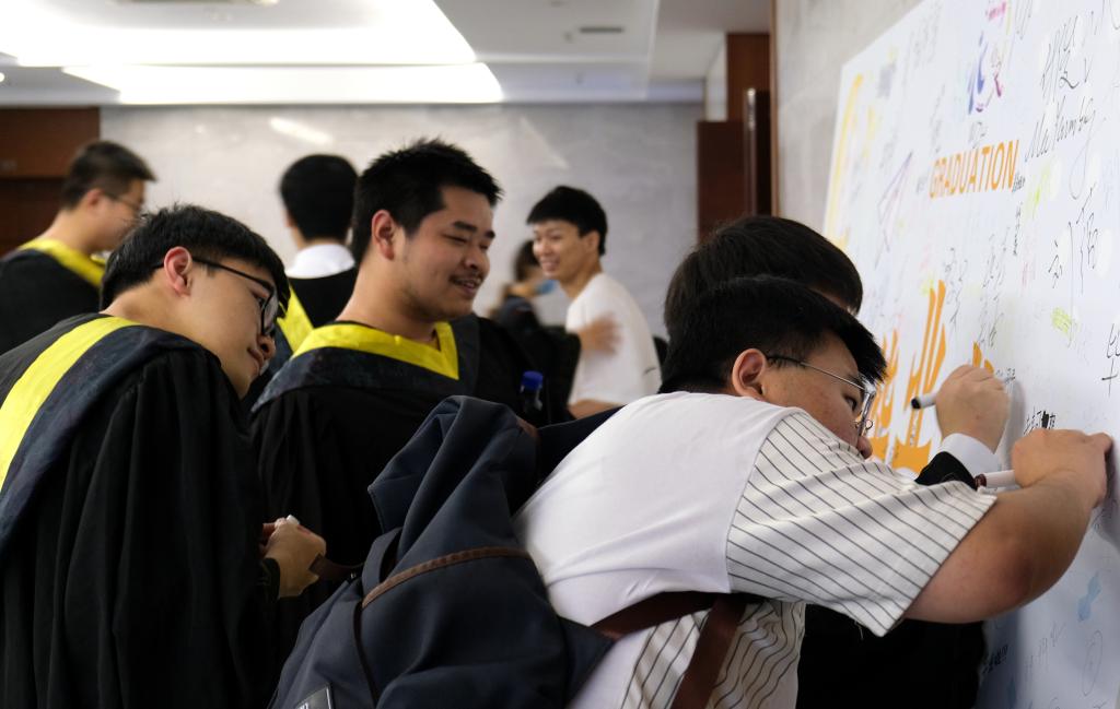典礼前,到场师生在会场前进行签名留念,共同欣赏精心制作的毕业视频,一帧一画,记录了91看片