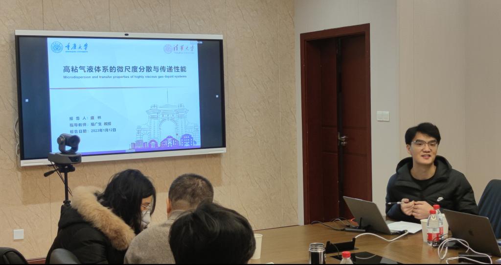 的领导老师们介绍了来访同学的专业、研究方向以及导师团队等情况,盛林博士作为学生代表,作了题为“高粘气液体系的微尺度分散与传递性能”的学术分享报告。