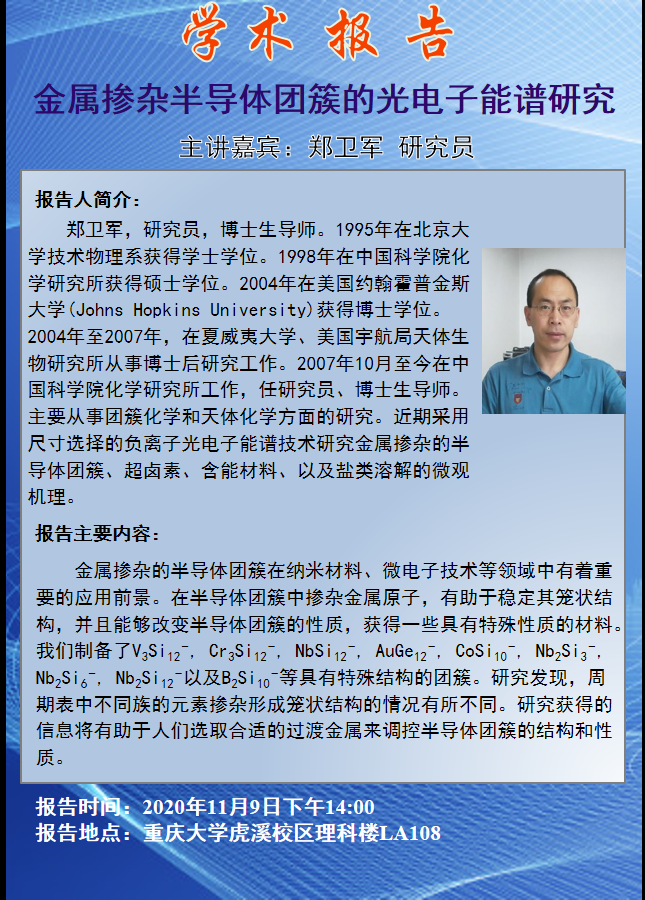 金属掺杂半导体团簇的光电子能谱研究 郑卫军研究员