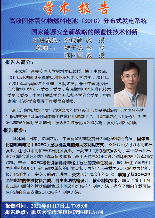 高效固体氧化物燃料电池(SOFC)分布式发电系统——国家能源安全新战略的颠覆性技术创新 李成新教授