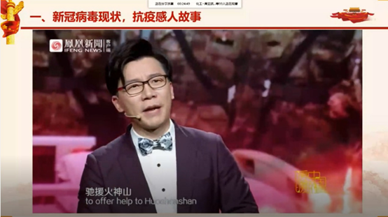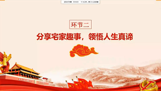 本次党团活动分为观看抗疫视频,弘扬中国精神、分享宅家趣事,领悟人生真谛和谱写诗词歌赋,共赴美好未来三个部分。首先通过观看建造火神山的励志感人抗击疫情视频,向同学们传递积极的、奋力拼搏、不畏艰险的中国精神,在视频结束后李汉唐等多位同学分享心得体会,向逆行者致敬,要勇挑担当,当下科学防疫,学习知识,让自己的青春焕发光彩。
