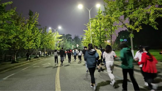 领队带领下进行跑前拉伸后,大家一齐出发,按照三食堂门口,沿着银杏大道,到北门,紧接着到西门,再回到出发地点的路线向前奔跑。同学们装备着绚丽多彩的荧光棒奔向前方,体验着健康奔跑的乐趣。