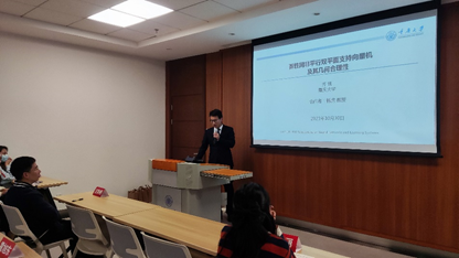 的博士研究生齐凯汇报了关于弹性网非平行双平面支持向量机及其几何合理性的研究,由研究背景逐渐深入,层层递进,环环相扣,再对机器学习进行专业性地剖析,得到了同学们热情的反馈。
