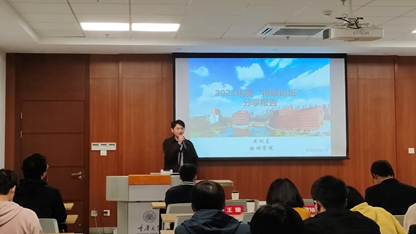博士研究生黄旭东汇报了“高能物理过程中QCD重整化能标设定及其应用和QCD圆圈计算”为主题的研究,讲述了学术信息、心得和成果,分享了如何选择研究课题,同时寄语同学们“脚踏实地,仰望星空”。
