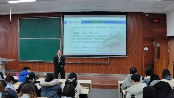 2020级于虎溪校区D1533召开本学期年级大会,辅导员伍丽老师及2020级全体同学出席了本次大会。
