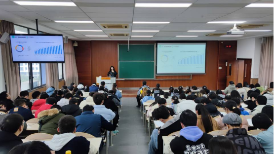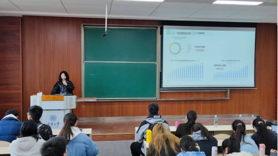 本次讲座主讲人曾易林老师是新东方的全球规划师,对于升学规划有着丰富经验。她从就业、读研、出国三个方面,为同学们详细介绍本科毕业后的选择。
